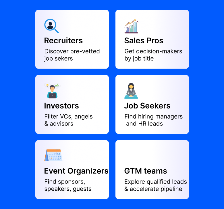 Search, filter, and connect with verified professionals across industries, roles, and intent signals in seconds.
